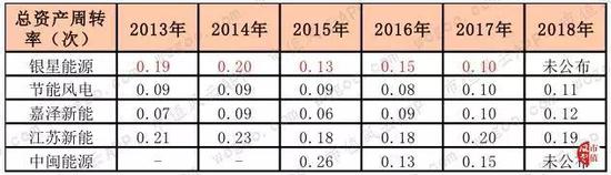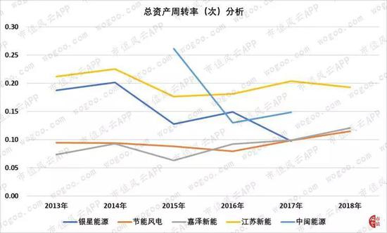 2017年,银星能源、节能风电、嘉泽新能、江苏新能和中闽能源的固定资产占总资产比例依次为77.24%、61.2%、69.52%、72.41%和68.55%。因此,采用总资产周转率判断5家上市公司的运营能力。