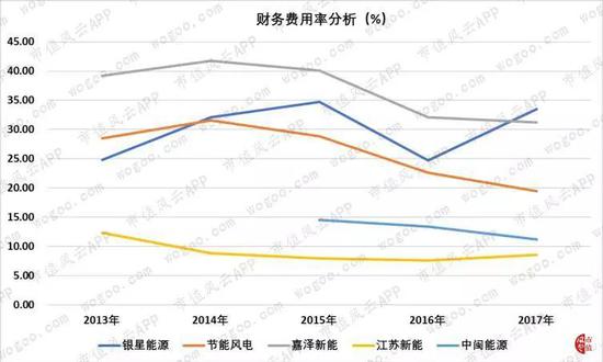 虽然银星能源的财务费用自2014年以后呈下降趋势,但财务费用率在24%和34%之间波动。节能风电、嘉泽新能和中闽能源的财务费用率出现类似趋势,在2017年分别为19.46%、27.53%和11.18%。