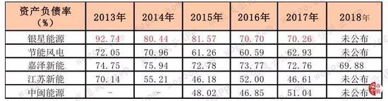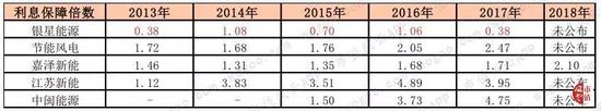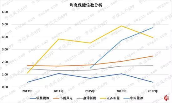 银星能源从2013年至2017年的利息保障倍数依次为0.38、1.08、0.7、1.06和0.38,处于同行业上市公司的最低水平,利息偿付能力较弱。