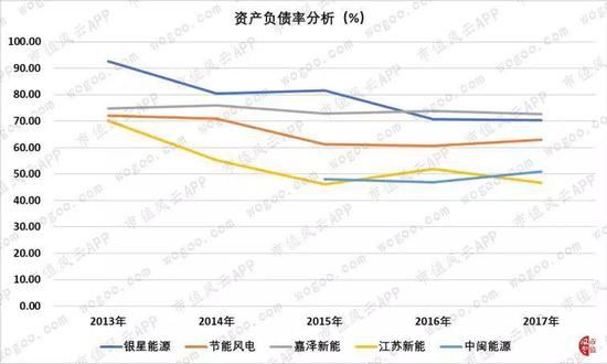 5家风电企业的资产负债率较高,银星能源曾在2013年达到92%,随后缓慢下降至70%附近。其中,银星能源、节能风电和嘉泽新能的资产负债率普遍高于江苏新能和中闽能源。