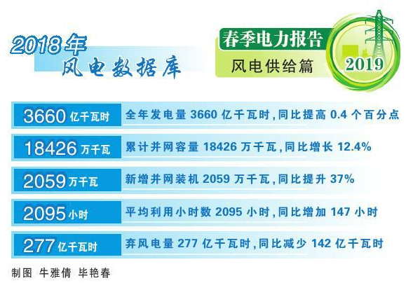 2018年风电量占全部发电量5.2%,比2017年提高0.4个百分点