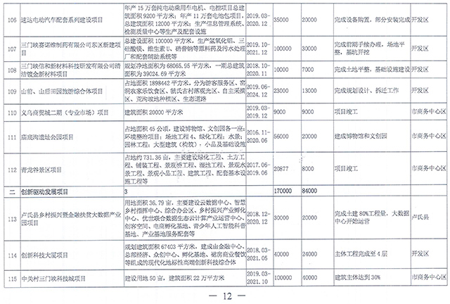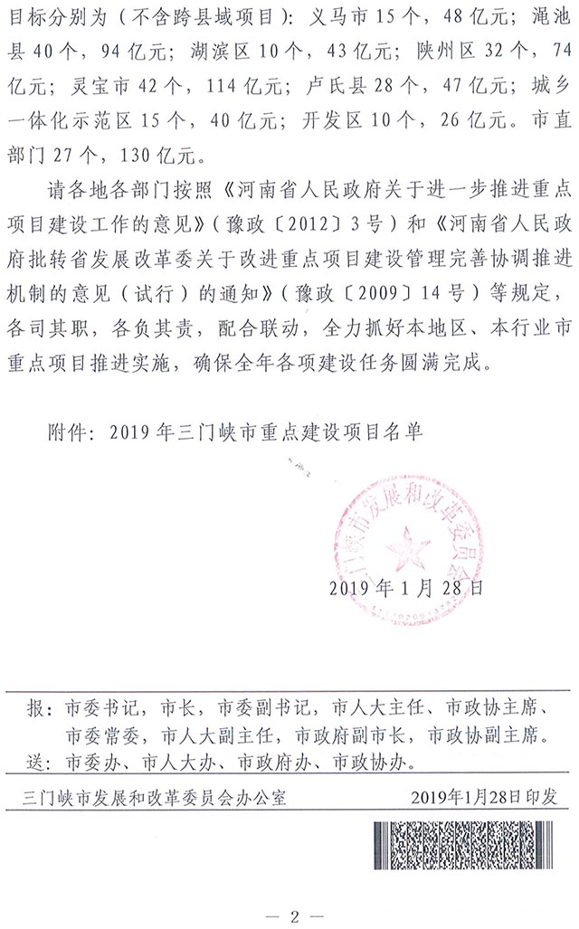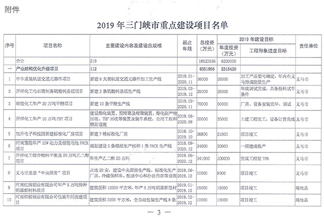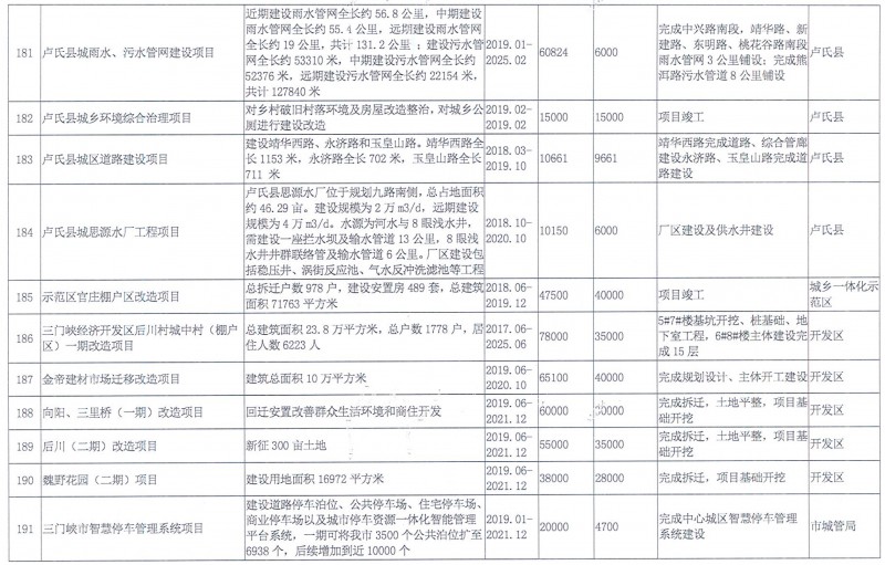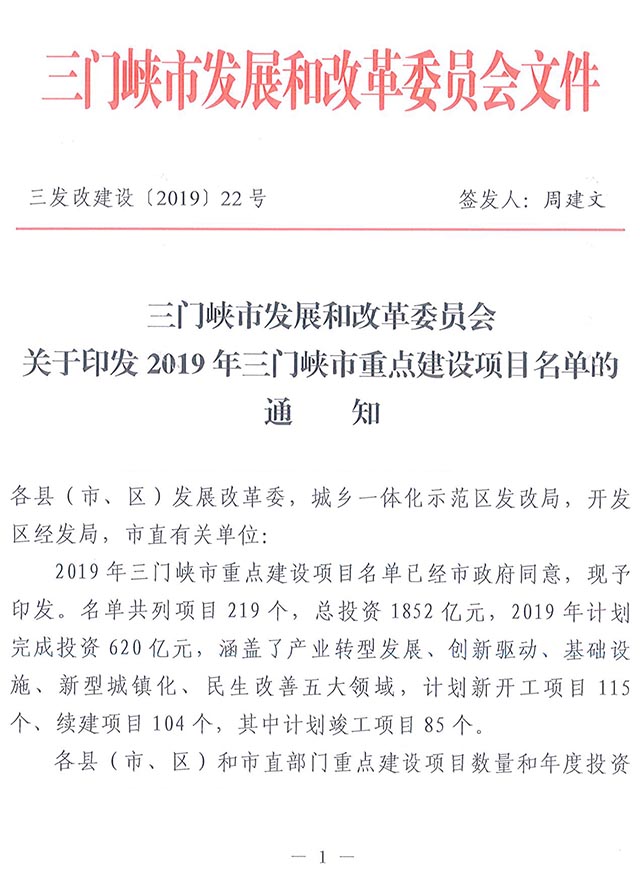 近日,河南省三门峡市发改委发布《关于2019年三门峡市重点建设项目名单的通知》。《通知》名单共列项目219个,总投资1852亿元,2019年计划完成投资620亿元,涵盖了产业转型发展、创新驱动、基础设施、新型城镇化、民生改善五大领域,计划新开工项目115个、续建项目104个,其中计划竣工项目85个。