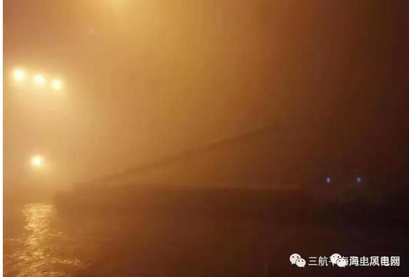 在27#机位平台搭设施工的第一天夜晚遇到了大雾天气,作业视线极差,若此时暂停施工,稳桩平台运输船舶将无法在第二天中午起大风浪前安全退场。这支的浓雾“拦路虎”正在阻碍我们“铁军”前进。
