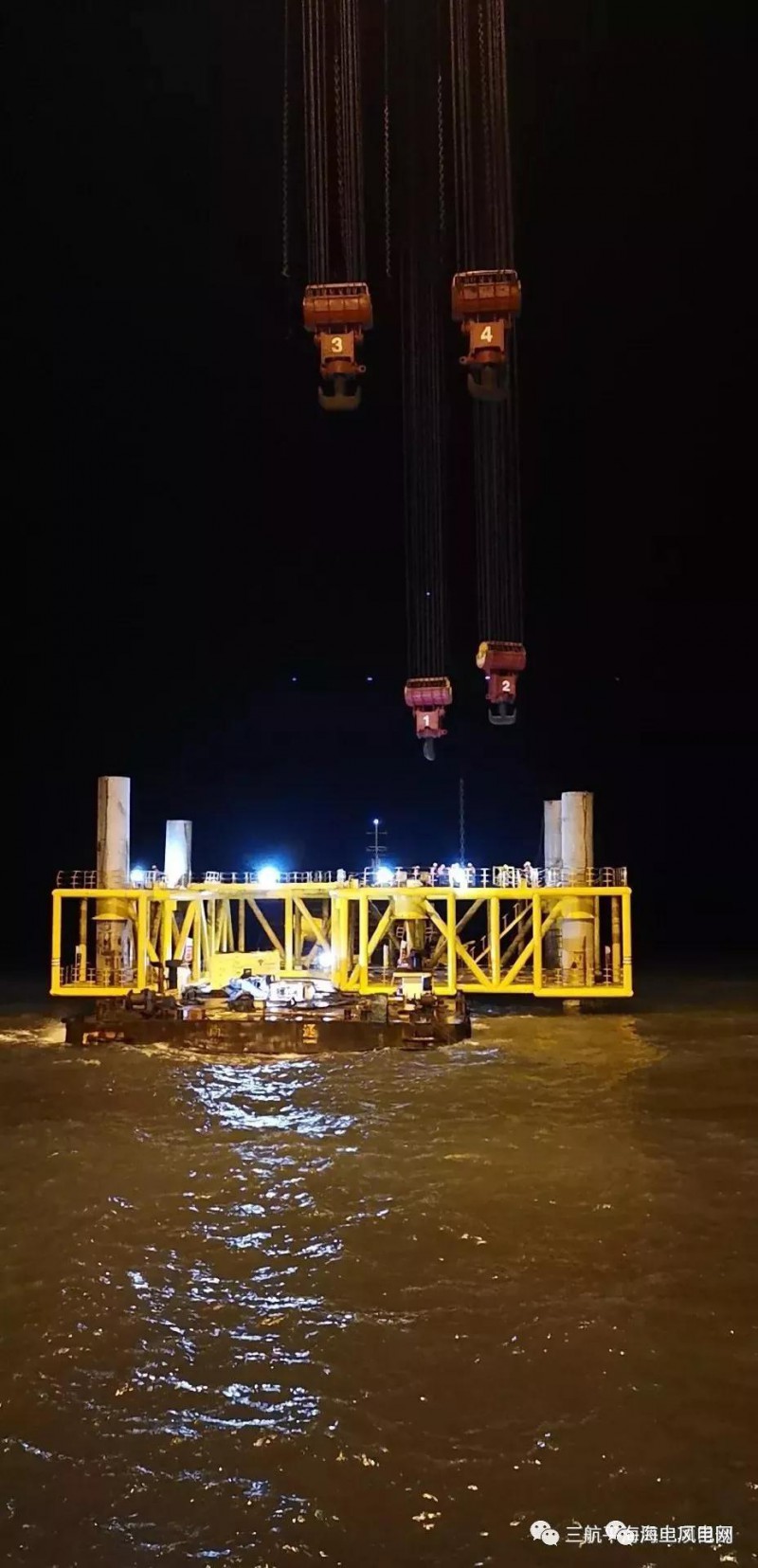 为了确保第4根辅助桩能插下,兄弟们深夜住船守候,实时观察现场涌浪走势,期间进行多次试吊,均以失败告终,虽然败了,但没有败了士气,仍然下定决心要完成,兄弟们这种屡败屡战的精神终于“击退”了每一只作业施工“拦路虎”,直至次日04:00,经过不眠之夜的持久作战,终于插下第4根辅助桩,并及时进入平台提升准备工作,11:30整个稳桩平台顺利完成提升和焊接固定,平台运输船顺利退场!