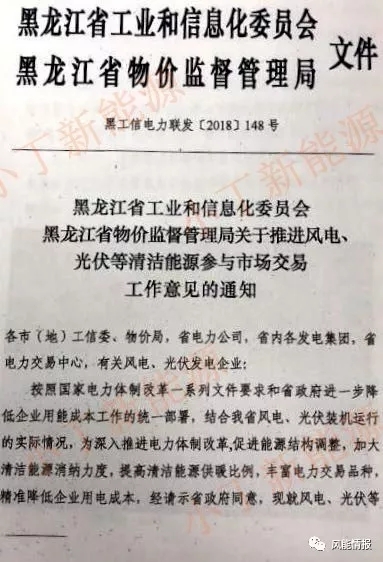 小丁也辗转得到了这份黑工信电力联发【2018】148号文件,《黑龙江省工业和信息化委员会、黑龙江物价监督管理局关于推进风电、光伏等清洁能源参与市场交易工作意见的通知》。