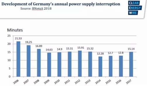 根据欧洲能源监管委员会(CEER)的数据,德国的电力供应安全是欧洲最好的。在CEER 2018报告对2016年数据的比较中,德国的SAIDI得分(包括特殊中断)13.3分钟在欧盟排名第二,略低于瑞士的9分钟。新能源电力的增加,对电力供应的安全几乎没有影响,甚至更好。