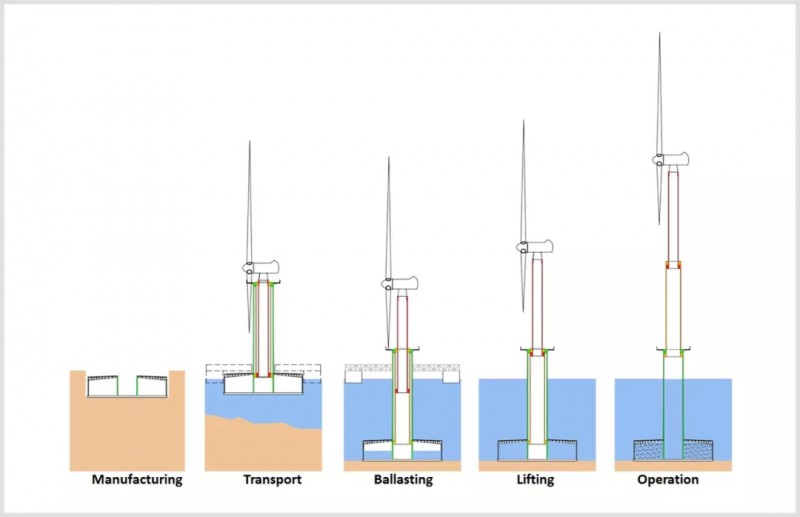 Elisa海上风机实验样机安装在Plocan试验风场,首先它采用了一种新型的自浮重力式基础系统。这种基础在海上运输式可作为驳船,基础上面安装了一个可自伸缩的塔筒,可在海上运输是降低重心,因此整个风机系统可在码头完成预组装,大大节省了海上安装时间和降低了安装风险。