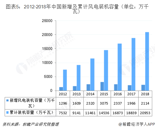 2012年以来中国风电装机增速保持在10%以上。根据中国风能协会统计数据,2018年全国(除港澳台地区除外)新增风电装机容量为2114万千瓦,同比增长7.5%,累计装机容量达到2.1亿千瓦,同比增长11.2%。