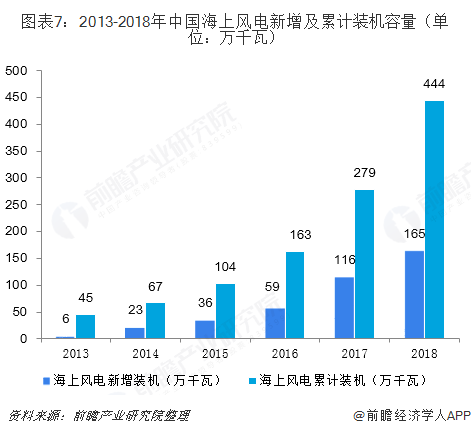 2018年,中国海上风电建设进一步提速。根据中国风能协会统计数据,2018年海上风电新增装机436台,新增风电装机容量165.5万千瓦,同比增长42.7%;累计装机容量达到444.5万千瓦,同比增长59.1%。