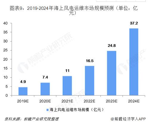 随着中国海上风电建设进入爆发期,未来海上运维市场需求势必将水涨船高。预计到2019年中国海上风电运维市场规模达到4.9亿元左右,2024年整体规模达到37亿元左右,年复合增长率达到50%左右。