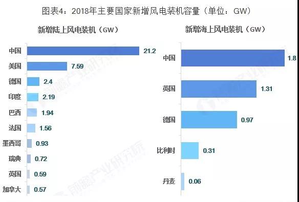根据全球风能协会(GWEC)统计数据,2018年中国新增陆上风电装机容量为21.2GW,新增海上风电装机容量为1.8GW,新增陆上风电跟海上风电装机均位列全球第一,新增风电装机容量占全球新增风电装机的44.83%,占比接近一半。