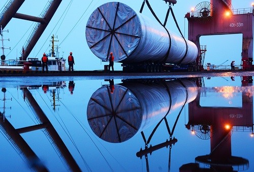 4月23日晚,中建安装集团中建五洲公司制造的首个海上风电塔筒从南京港吊装。这是该公司为上海临港海上风电项目制造的首个海上风电塔筒,装机容量6MW,总重400多吨,高95米。