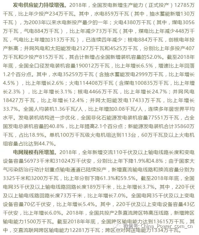 《行业发展报告2019》指出,2018年,在以习近平同志为核心的党中央坚强领导下,电力行业以习近平新时代中国特色社会主义思想为指导,坚决落实党中央、国务院决策部署和“四个革命、一个合作”能源安全新战略,按照高质量发展的根本要求,加大电力结构调整力度,继续加快清洁能源发展,促进跨区跨省送电,推进清洁能源大范围优化配置,推进终端能源电气化利用水平;深化电力体制改革,大力推进电力市场建设,推动电力科技创新;进一步加强绿色发展,积极应对气候变化;不断扩大“一带一路”电力国际合作,持续构建清洁低碳、安全高效的现代能源体系。2018年,电力行业发展呈现九大特征。