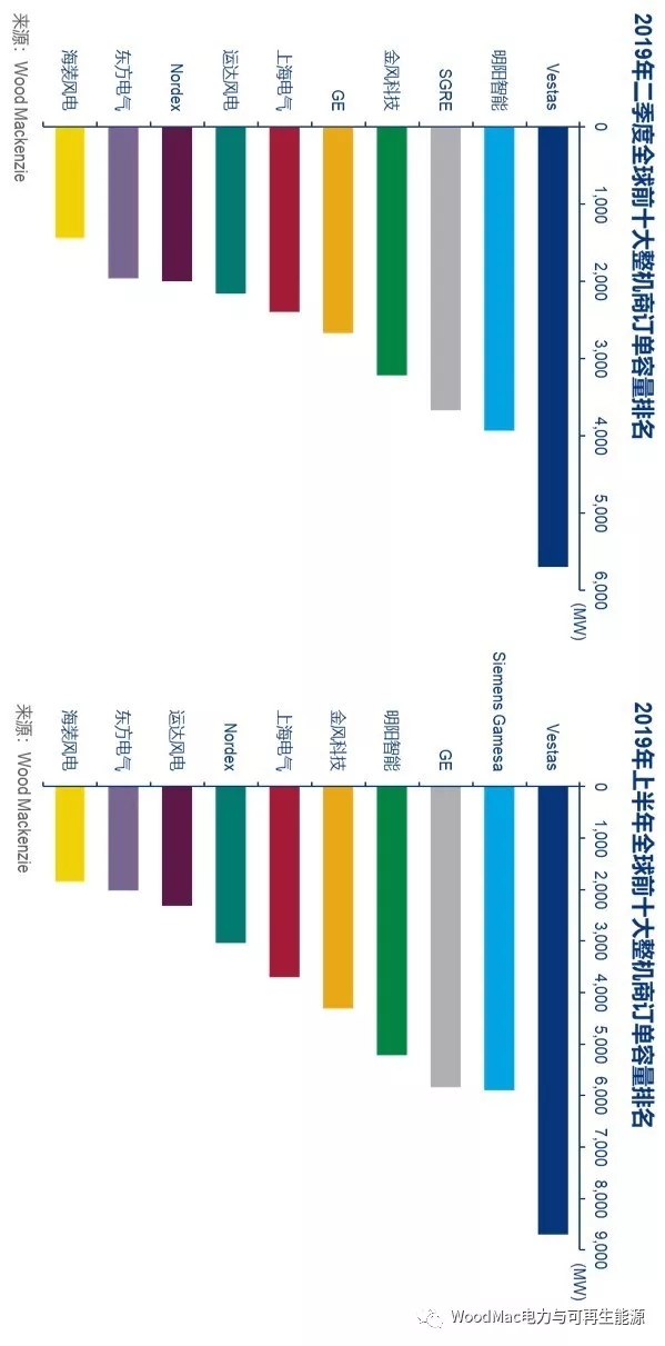 2019年第二季度,中国开发商的风机采购总容量超过17GW,同比增长267%。其中71%的订单来自于三北部地区陆上风电场。中国五大开发商的订单量均超过1GW。