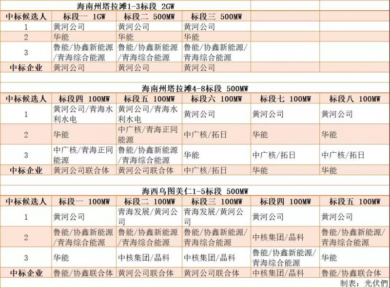 9月25日,青海省海南州特高压外送基地(3GW光伏+2GW)电源配置项目投资主体招标中标候选人公示,9月28日公示结束。其中,黄河公司、黄河公司联合体、中广核/拓日、华能、鲁能/协鑫/青海综合能源、中核/晶科拟中标光伏标段;国家电投、国家电投联合体、华电、大唐/青海公共设施、大唐/青海创安、三峡/阳光电源、京能拟中标风电标段。