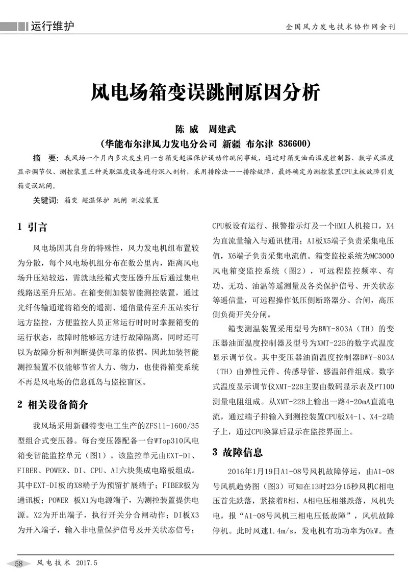 风场一个月内多次发生同一台箱变超温保护误动作跳闸事故,通过对箱变油面温度控制器、数字式温度显示调节仪、测控装置三种关联温度设备进行深入剖析,采用排除法一一排除故障,最终确定为测控装置CPU主板故障引发箱变误跳闸。