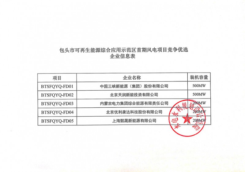 内蒙古包头市政府日前发布《包头市可再生能源综合应用示范区首期风电项目优选结果公示》,项目装机规模为1600MW。其中三峡新能源(500MW)、天润新能(500MW)、内蒙古电力集团综合能源有限责任公司(200MW)、优利康达(200MW)、上海懿晟新能源有限公司(200MW)。公示如下: