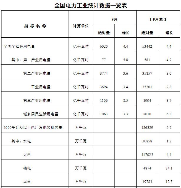 10月23日,国家能源局发布1-9月份全国电力工业统计数据。