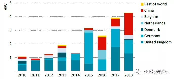 2010~2018年,全球海上风电市场年均增长近30%,得益于快速的技术改进。在未来五年内,全球计划完成约150个新建海上风电项目,这表明海上风电在电力供应中的作用越来越大。英国、德国和丹麦推动了欧洲的海上风电技术发展。2018年,英国15%的电力来自海上风电。2018年,中国新增的海上风电装机超过世界其他国家。
