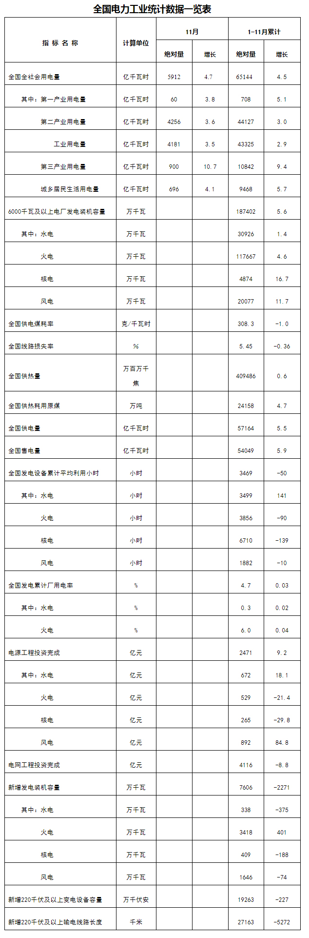 国家能源局发布1-11月份全国电力工业统计数据:风电用电量增长11.7%