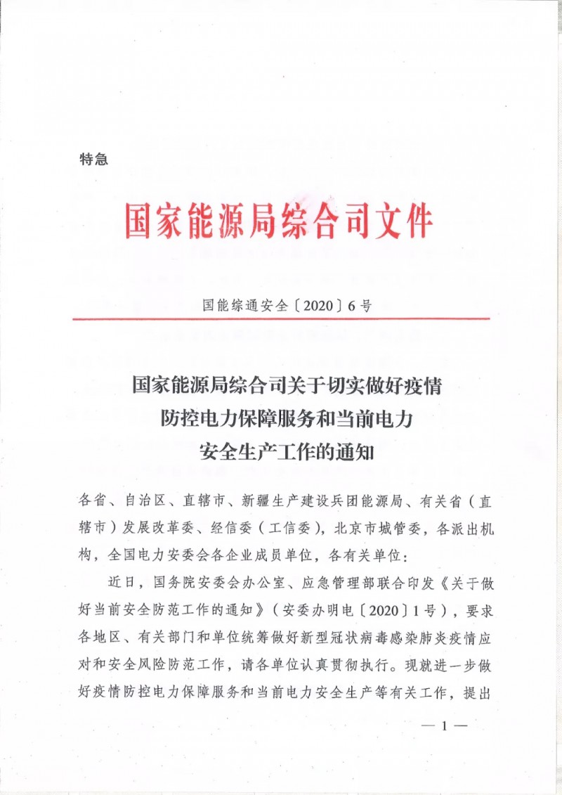 1月30日,国家能源局综合司印发《关于切实做好疫情防控电力保障服务和当前电力安全生产工作的通知》(国能综通安全〔2020〕6号),就进一步做好疫情防控电力保障服务和当前电力安全生产等有关工作提出要求。全文如下: