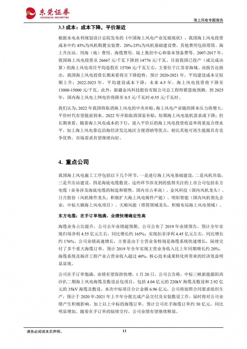 我国海上风电施工工序包括以下几个环节,一是进行海上风电基础建设,二是风机吊装,三是升压站建设,四是海底电缆敷设。这些环节涉及到的值得关注的上市公司包括东方电缆(业务涉及海底电缆的制造和销售,国内市占率高)、金风科技(国内风机龙头)、日月股份(风机铸件龙头,积极扩大海上风电铸件产能)、明阳智能(国内风机领先企业,中标大额海上风电项目)、天顺风能(塔筒领域龙头,积极布局海上风电领域)。