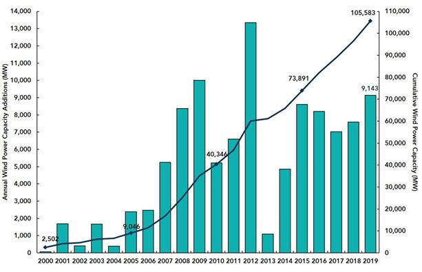 图1:2000-2019年美国风电新增/累计风电装机容量