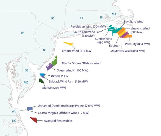 陆上风电的蓬勃发展也延伸到了海上,2019年,东海岸沿线有六个州宣布了共计16300 MW的海上风电建设目标。这比之前承诺过的海上风电建设目标翻了一番还多,现在已超25000MW。新泽西州州长Phil Murphy宣布将于2035年之前将花园州的海上风电发展目标扩大到7500MW。