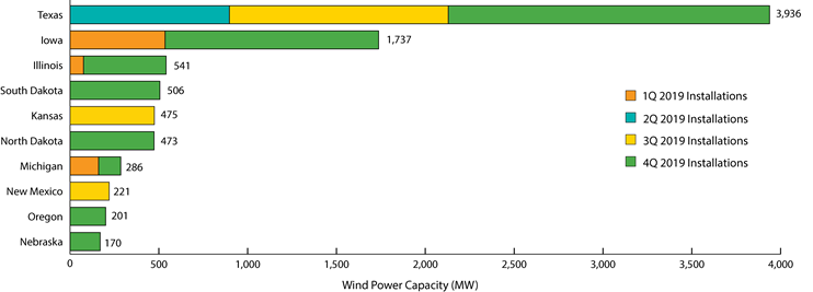 2019年,美国19个州共计有55个新增风电场开始运行。其中得克萨斯州和爱荷华州是美国风电装机容量最大的两个州,长期以来一直是美国风电领域的引领者,2019年更是取得了重大进展。德克萨斯州2019年新增风电项目近4GW,爱荷华州新增风电项目1.7GW,这也突破了他们之前的单年安装新记录。伊利诺伊州,南达科他州和堪萨斯州纷纷排在年度前五。爱荷华州是第二个装机容量超10000MW的州,而伊利诺伊州则成为了第六个装机容量超5000MW的州。