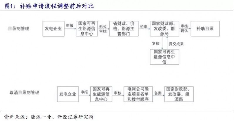 目录制管理取消,项目清单制上线。《意见》提出国家不再发布可再生能源电价附加目录,所有可再生能源项目通过国家可再生能源信息管理平台填报电价附加申请信息。流程的简化加速发电企业的项目补贴确权及补贴兑付进度,确保资金及时拨付,利好企业融资以及电站交易。另一方面,目录制度调整为项目清单制,使存量项目进入项目补贴清单,为风光电站存量项目销售提供背书,有利于风光电站存量交易。