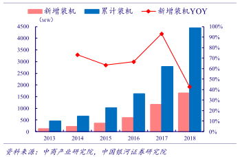 海上风电蓬勃向上。我国海上风电资源丰富,潜力巨大,且靠近东部负荷中心,就地消纳方便。发展海上风电或将成为我国能源结构转型的重要战略支撑。2018 年我国海风发展提速,新增装机436台容量1.65GW,同比增长42.7%,排名世界第一。截至2018 年底,我国的海风累计装机4.45GW,在建6.47GW,已成为仅次于英国和德国的第三大海上风电国家。