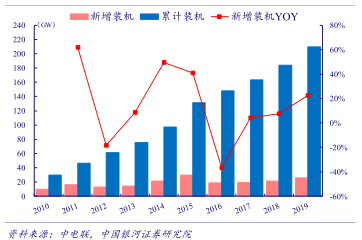 中国已经成为全球最大风电市场。根据全球风能协会GWEA 数据,我国风电累计装机容量占全球比重从 2000 年的2.0%增长至2018 年的 35.4%。根据中电联,2019 年我国风电新增装机达到25.7GW(+22.6%),累计容量达到210GW。