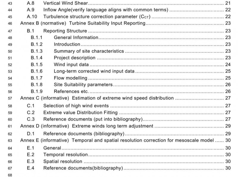 鉴于最终用户对场址适应性标准的需求强烈,且该部分编写进度领先,2019年初工作组在第17次会上决定将该标准分为两个子标准分别发布,即:IEC 61400-15-1(Site suitability input conditions,场址适应性输入条件)与IEC 61400-15-2(Assessment of the wind resources and energy yield for both onshore and offshore wind plants,陆上和海上风电场风资源和发电量计算)。其中场址适应性部分预计于2020年提交CDV版(Committee Draft for Voting)。