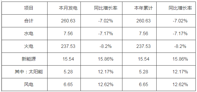 (一)发电量情况。1月份当月,全省发电量260.63亿千瓦时,同比减少7.02%。其中水电7.56亿千瓦时,同比减少7.17%;火电237.53亿千瓦时,同比减少8.2%;新能源15.54亿千瓦时,同比增长15.86%。