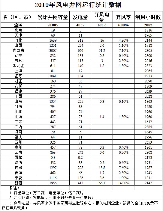 2019年,全国风电平均利用小时数2082小时,风电平均利用小时数较高的地区是云南(2808小时)、福建(2639小时)、四川(2553小时)、广西(2385小时)和黑龙江(2323小时)。2019年弃风电量169亿千瓦时,同比减少108亿千瓦时,平均弃风率4%,同比下降3个百分点,弃风限电状况进一步得到缓解。