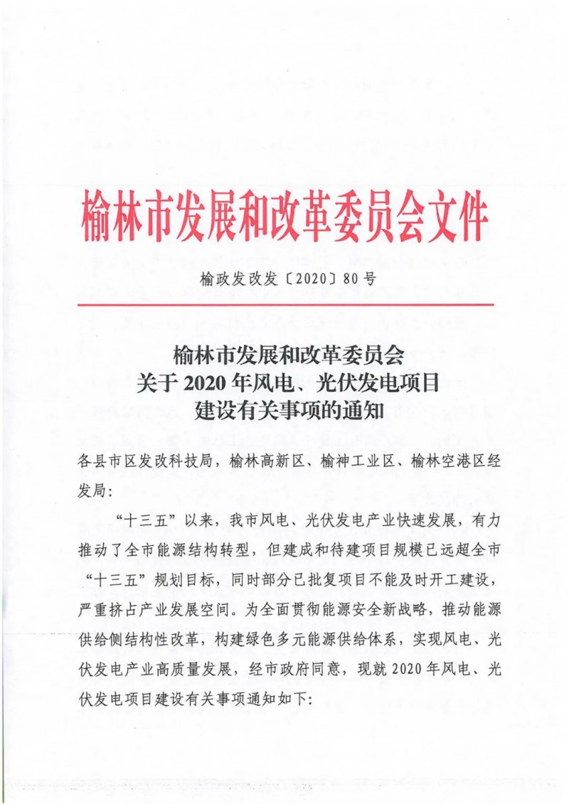 3月26日,榆林发改委发布《关于2020年风电、光伏发电项目建设有关事项的通知》明确暂停2020年风电、光伏发电项目申报(包括神木市、府谷县),重点加快推进存量项目建设。