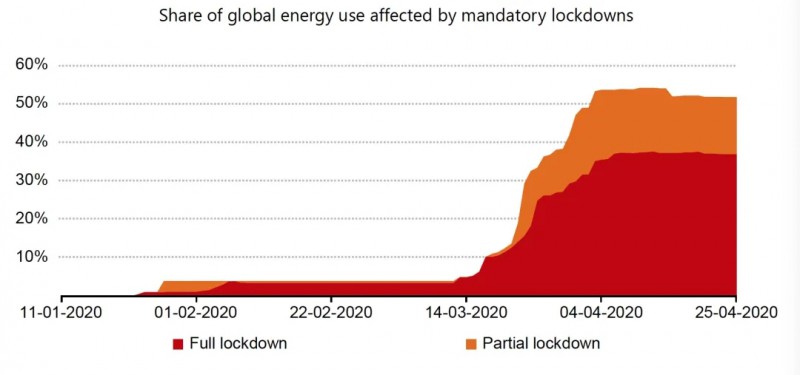 新冠肺炎疫情已经成为全球卫生危机,截至4月28日已有300万例确诊病例,并导致20多万人死亡。世界各国为降低病毒传播速度而采取的封锁措施,使得到4月中旬全球已有占全球能源消费50%以上的人口受到影响,这一数字在3月中旬还仅为5%(图1)。4月份处于完全封锁状态的国家每周能源需求平均下降25%,处于部分封锁状态的国家平均下降18%。