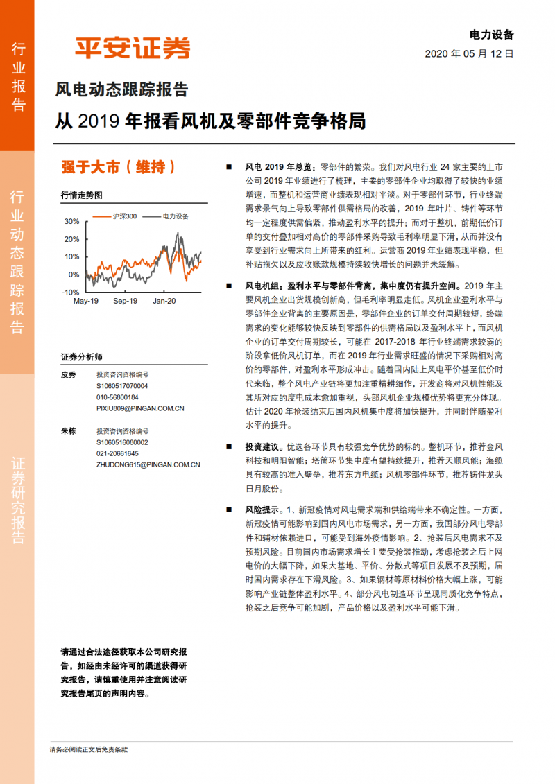 风电 2019 年总览:零部件的繁荣。我们对风电行业 24 家主要的上市公司 2019 年业绩进行了梳理,主要的零部件企业均取得了较快的业绩增速,而整机和运营商业绩表现相对平淡。对于零部件环节,行业终端需求景气向上导致零部件供需格局的改善,2019 年叶片、铸件等环节均一定程度供需偏紧,推动盈利水平的提升;而对于整机,前期低价订单的交付叠加相对高价的零部件采购导致毛利率明显下滑,从而并没有享受到行业需求向上所带来的红利。运营商 2019 年业绩表现平稳,但补贴拖欠以及应收账款规模持续较快增长的问题并未缓解。