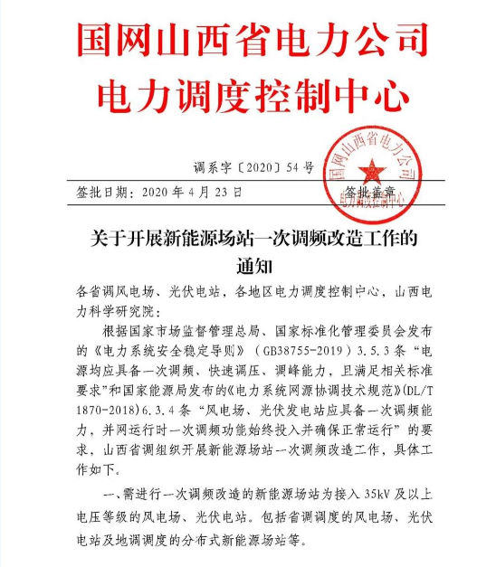 近日,国网山西电力公司电力调度控制中心发布了关于开展新能源场站一次调频改造工作的通知。