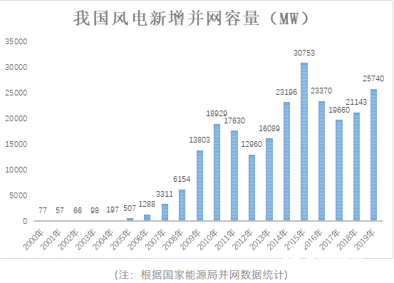 根据国家能源局电力并网数据统计,截止2019年末,我国累计风电并网容量2.1亿千瓦,2019年新增并网容量2574万千瓦。