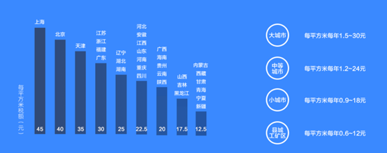 因此,如项目处于城镇范围内,则须缴纳土地使用税。征税标准依据《中华人民共和国城镇土地使用税暂行条例》,土地使用税每平方米年税额如下:(一)大城市1.5元至30元;(二)中等城市1.2元至24元;(三)小城市0.9元至18元;(四)县城、建制镇、工矿区0.6元至12元。不同地区的总体税率水平,可参考下图: