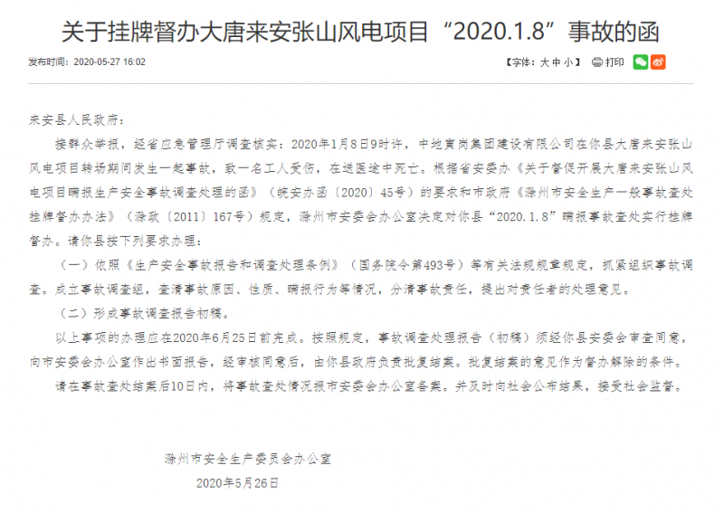 目前,滁州市安委会办公室正在根据安徽省省安委办《关于督促开展大唐来安张山风电项目瞒报生产安全事故调查处理的函》(皖安办函〔2020〕45号)的要求和滁州市政府《滁州市安全生产一般事故查处挂牌督办办法》(滁政〔2011〕167号)规定,滁州市安委会办公室决定对来安县“2020.1.8”瞒报事故查处实行挂牌督办。