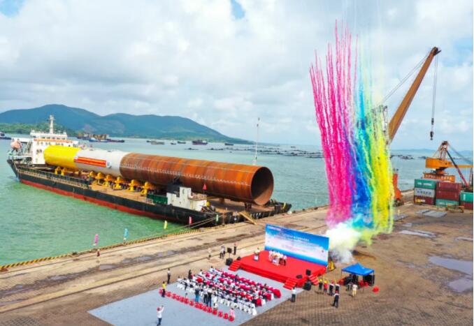 上午,广东阳江港港务有限公司7号泊位上,巨大的单桩基础钢管桩被装载上船,即将运往三峡阳西沙扒海上风电一期项目16号机位安装。