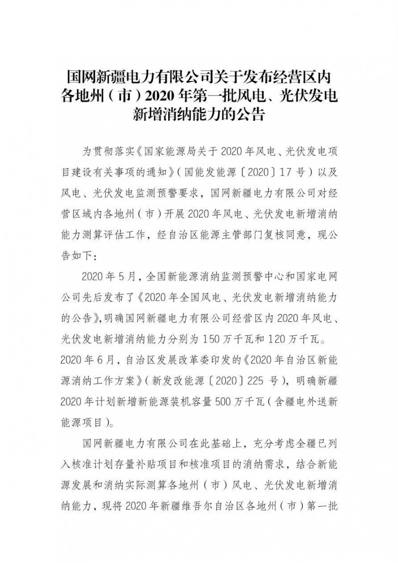近日,国网新疆发布关于经营区内各地州(市)2020年第一批风电、光伏发电新增消纳能力的公告,风电新增消纳能力80万千瓦,其中集中式项目60万千瓦,分散式项目18万千瓦。原文如下: