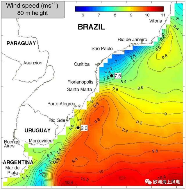 巴西拥有7400公里长的海岸线和非常浅的大陆架,水深平均不到20米,风资源极好,理论上可利用的海上风电储量高达7亿千瓦。如果考虑轮毂高度100米处的平均风速大于7米每秒,那么巴西潜在开发区域集中在南部、北部和东北部海域。