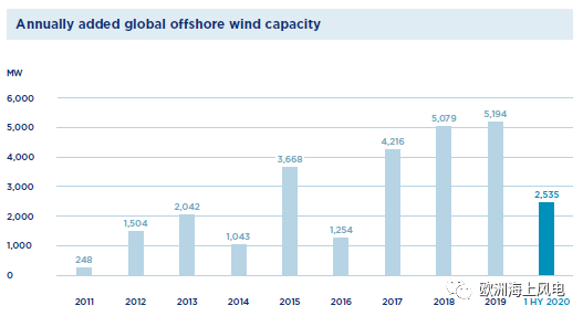 WFO本月发布了“2020年上半年全球海上风电报告”,统计显示,尽管受新冠疫情影响,全球上半年海上风电投产容量仍然超过250万千瓦,达到了2.535GW。