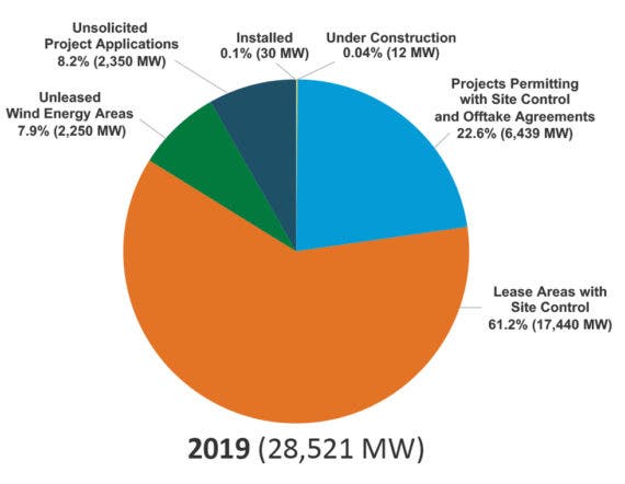 美国目前只有一个商业海上风电场在运营,但是NREL的2019年数据显示技术不断进步,价格下降以及联邦和州对美国海上风电行业的支持增加。到2019年底,美国海上风电项目管道增长了10%,而在经联邦和州政府批准并签署了承购协议的情况下,美国海上风电容量为6,439兆瓦,比上一年增长了三倍。