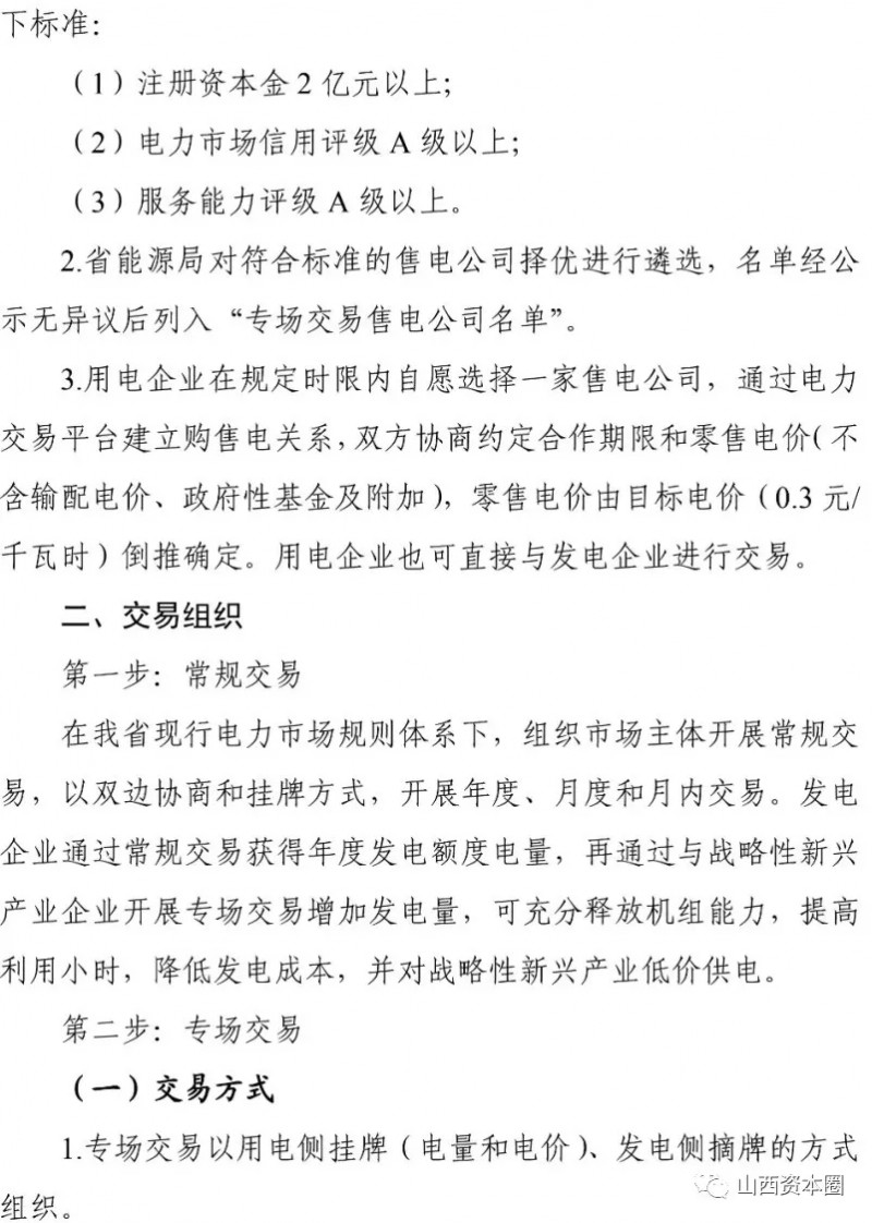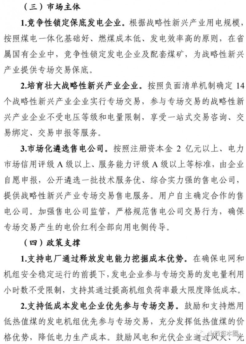 《实施方案》主要涉及三个方面的政策措施:一是通过配套措施支持发电企业挖掘成本优势。对战略性新兴产业企业用电实行市场充分竞争交易。配套的支持措施包括:发电企业参与交易的利用小时数不受限制;鼓励燃用低热质煤的发电机组优先参与交易;鼓励以风火打捆方式参与交易等。