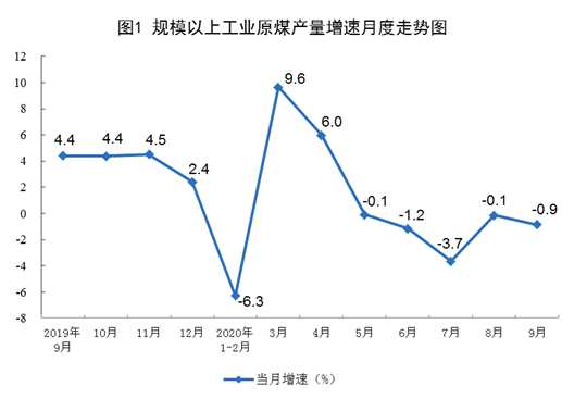原煤生产降幅略有扩大。9月份,生产原煤3.3亿吨,同比下降0.9%,降幅比上月扩大0.8个百分点;日均产量1104万吨,环比增加53万吨。1—9月份,生产原煤27.9亿吨,同比下降0.1%。