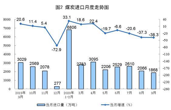 煤炭进口降幅继续扩大。9月份,进口煤炭1868万吨,环比减少198万吨,同比下降38.3%,降幅比上月扩大1.0个百分点;1—9月份,进口煤炭2.4亿吨,同比下降4.4%。